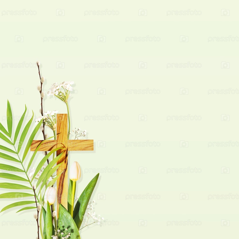 Христианский крест с пальмовыми листьями, весенними цветами и естественными ветвями на мягком зеленом фоне с копировальным пространством. пасхальное изображение веры для церковного приветствия, богослужебного поста, молитвенной карточки и дизайна Святой н