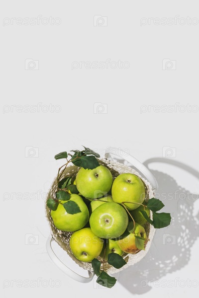 Свежие зеленые яблоки с листовыми ветвями в тканей корзине на светлом фоне