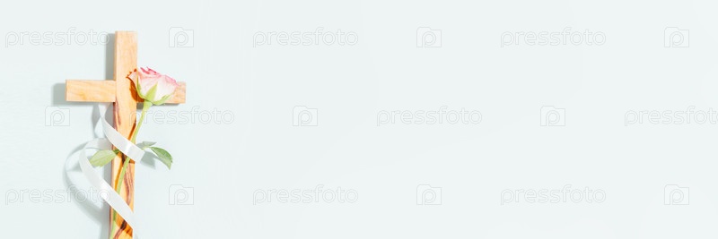 Христианский крест с бледной розой и лентой, расположенной на светлом фоне с широким копировальным пространством
