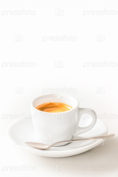 Белая чашка эспрессо с кофейной кремой на тарелке и ложкой, расположенные на чистом белом фоне с копировальным пространством.Минимальное вертикальное изображение кафе для брендинга кофе, афиши меню, утренней рекламы и дизайна напитков