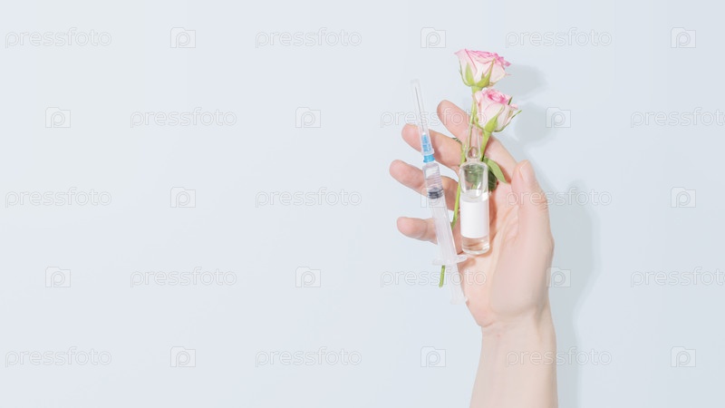 Концепция инъекции красоты с ручным шприцем, ампулой и розовыми розами