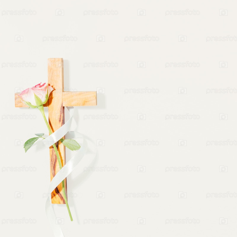 Христианский фон с деревянным крестом, бледной розой и лентой на светло-сером фоне с копировальным пространством Чистый религиозный фон для пасхального приветствия, церковного плаката, дизайна веры, духовного приглашения