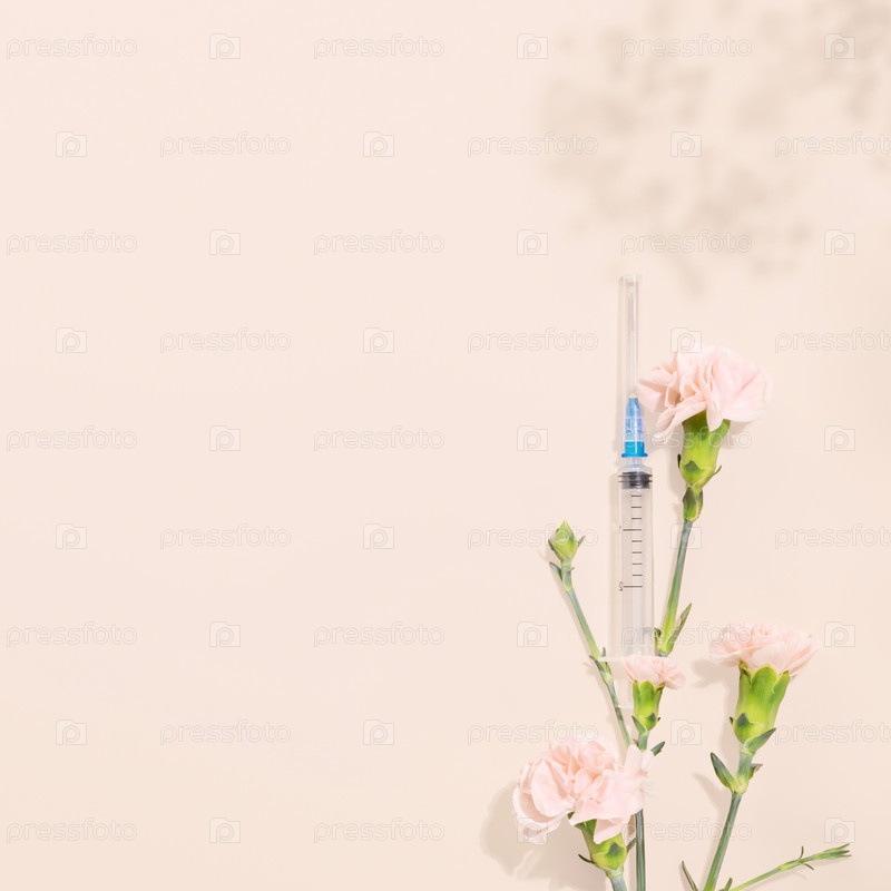 Косметический шприц и мягкие розовые цветы на бежевом фоне