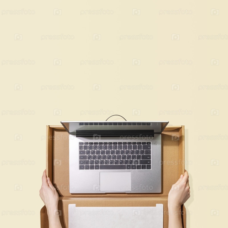 Ноутбук в картонной коробке для доставки, удерживаемой руками на нейтральном бежевом фоне