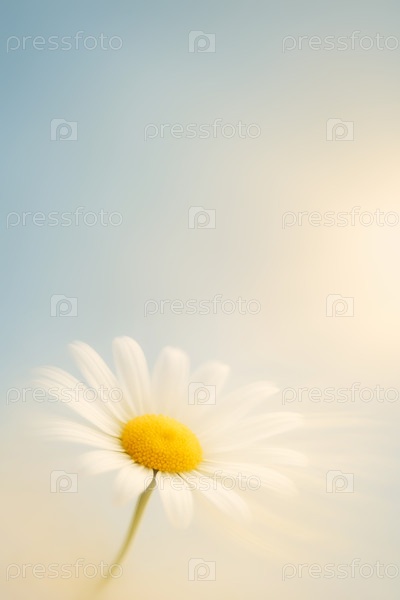 Одинокая белая ромашка на мягком пастельном фоне с копировальным пространством и нежным солнечным светом. минимальный вертикальный цветочный фон для весеннего поста, поздравительной карточки, женского брендинга и сезонного дизайна