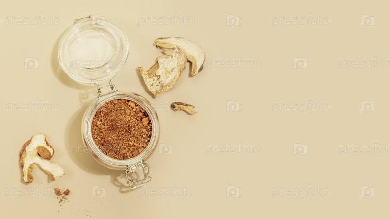 Грибный порошок в открытой стеклянной банке с сушеными кусочками грибов и копировальным пространством