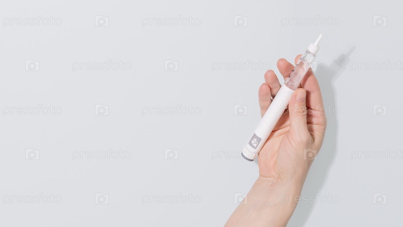 Удерживающая ручку для инъекций на мягком голубом фоне с копировальным пространством, для ухода за диабетом, терапии потери веса и медицинского содержания здоровья, с минимальным клиническим стилем и современной концепцией здравоохранения Hand