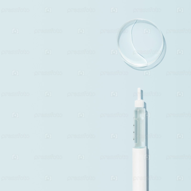 GLP 1 ручка для инъекций с прозрачной чашей Петри на мягком синем фоне и копировальным пространством