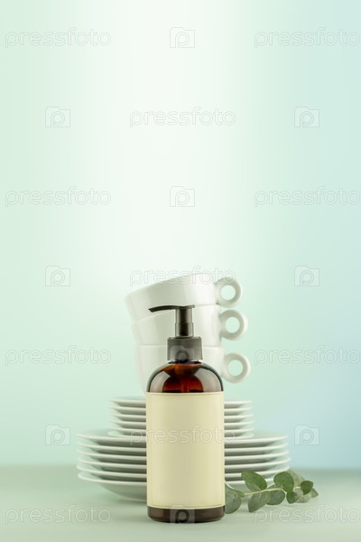 Мокет бутылки для посудомоечной жидкости с чистыми тарелками и чашками в минимальной кухонной сцене.Концепция шаблона дизайна упаковки моющих средств, брендинга продуктов бытовой чистки и современного визуального обслуживания дома