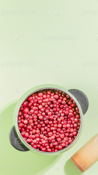 Свежие клюквы в металлической кастрюле на мягком зеленом фоне с копировальным пространством
