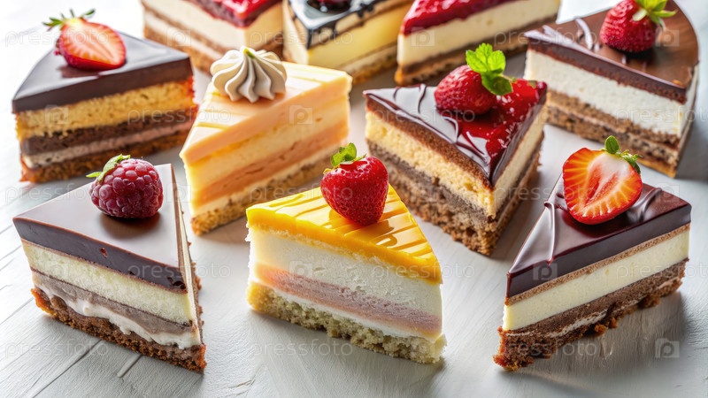 Ассортимент красочных фрагментов торта, отображаемых на белой деревянной поверхности с различными вкусами и начинками для восхитительного десертного опыта