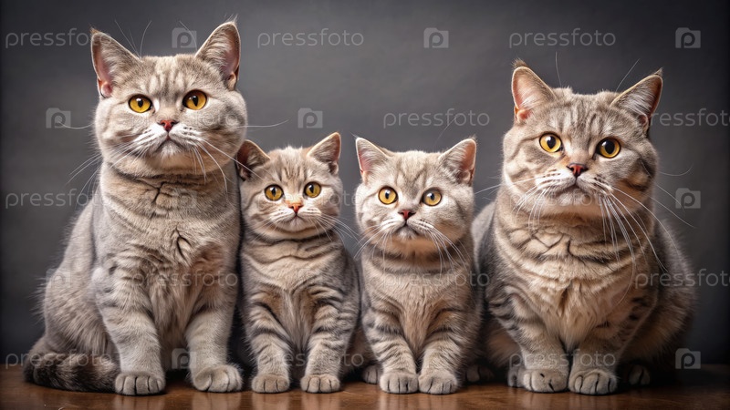 Семейный портрет британских короткошерстных кошек, выстроенных в очереди на студии днем
