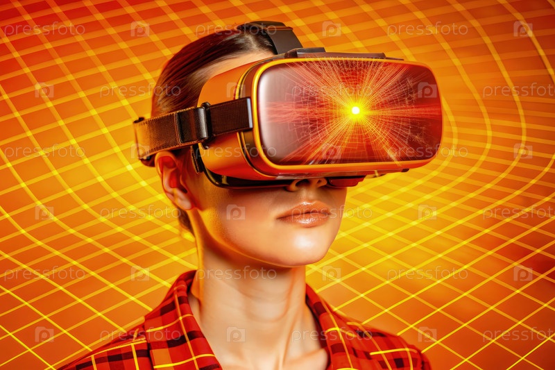 Ближайший снимок человека, использующего гарнитуру виртуальной реальности на ярком геометрическом фоне
