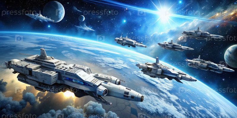 Армада массивных бронированных научно-фантастических военных космических кораблей навигирует по яркой галактике, окруженной планетами и звездным фоном