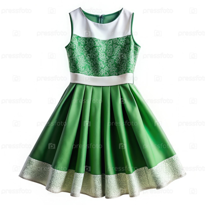 Стильное зелено-белое платье с расширенной юбкой на чистом белом фоне, идеально подходит для официальных случаев или летних мероприятий