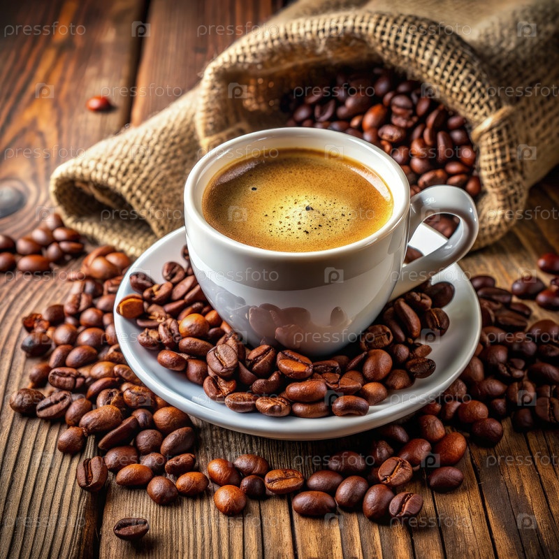 Наслаждайтесь свежеприготовленной чашечкой кофе, подаваемой с разбросанными кофейными зернами на деревянном деревянном столе с мешочком вблизи