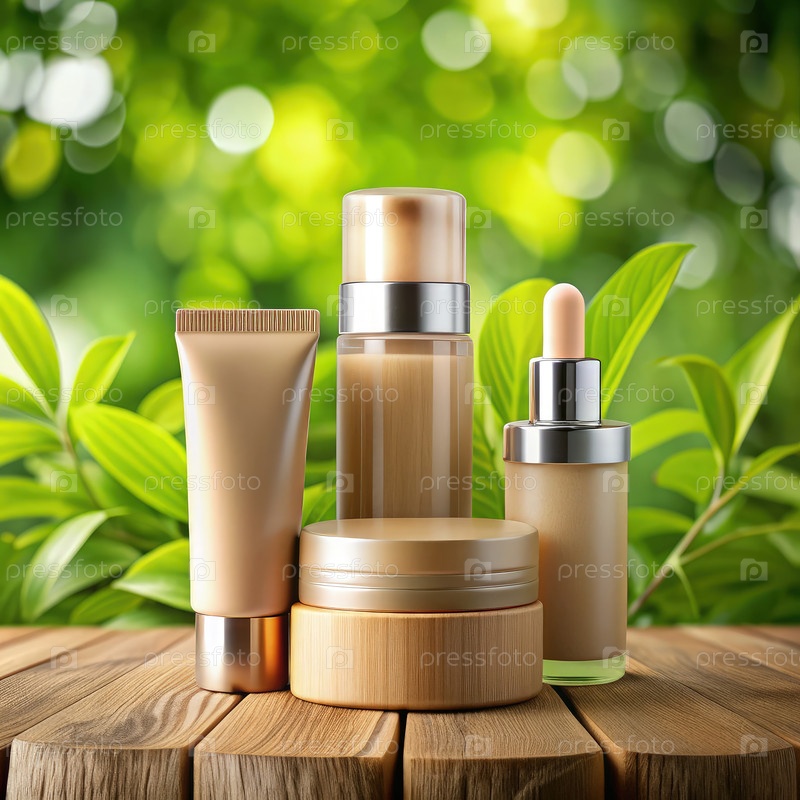 Витрина экологически чистой упаковки косметической продукции на деревянной поверхности с пышным зеленым фоном в дневное время