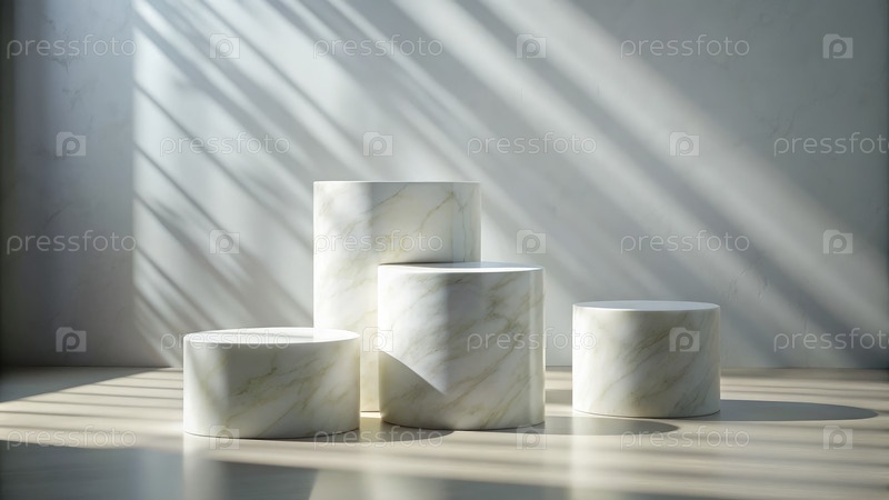Трио белых мраморных пьедесталов, художественно расположенные в мягко освещенной комнате, демонстрируют элегантный дизайн и текстуру