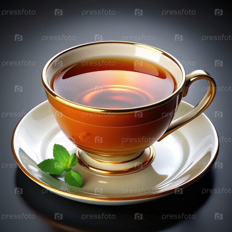 Теплая чашка травяного чая со свежей мятой на тарелке на темном фоне