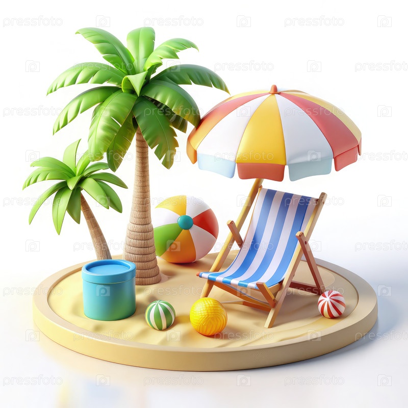 Летний элемент пляжного набора с красочными пальмами, полосатым креслом и аксессуарами для пляжа на белом фоне