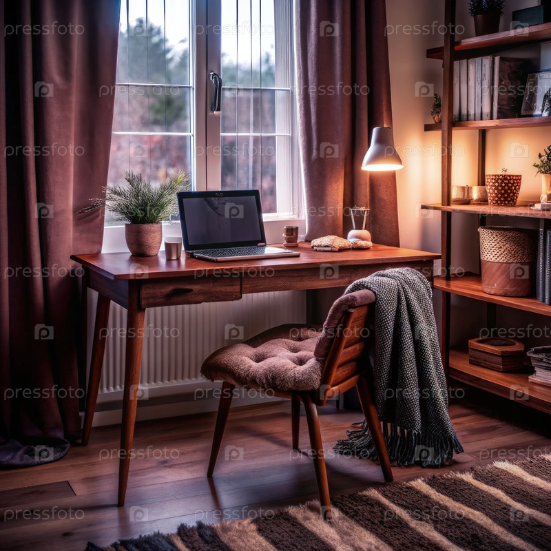 Уютный домашний офис с естественным светом, теплым декором и приглашающим рабочим пространством для продуктивных вечеров и творческого вдохновения