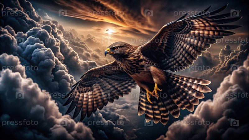 Ястреб грациозно взлетает сквозь красочные облака на закате