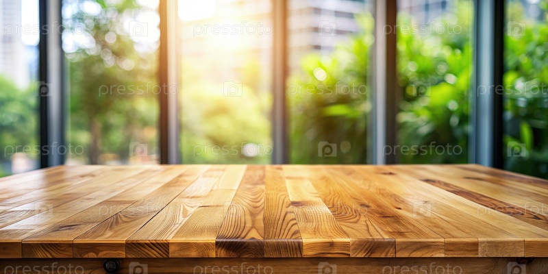 Пустой деревянный стол, купающийся в солнечном свете возле больших окон, демонстрирующих зелень в спокойной городской обстановке поздним днем