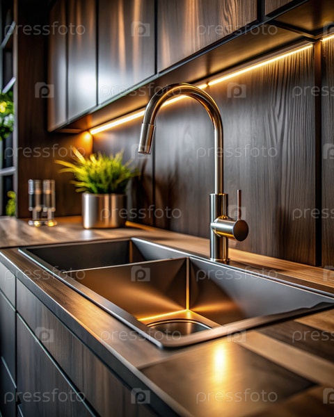 Близкий взгляд на гладкую, современную раковину в дизайнерской темной кухне с элегантными отделками и освещением окружающей среды