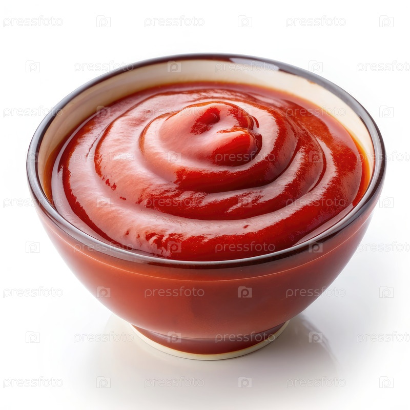 Чаша свежеприготовленного кетчупа, изолированная на чистом белом фоне для кулинарного использования