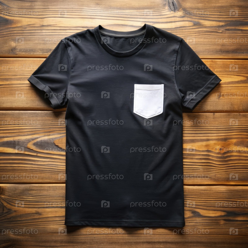 Черная футболка с белым карманом, отображаемым на деревянной поверхности