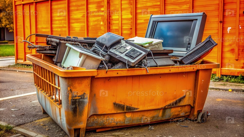 Мусорный контейнер, заполненный отброшенной офисной техникой, расположен на городской улице в дневное время
