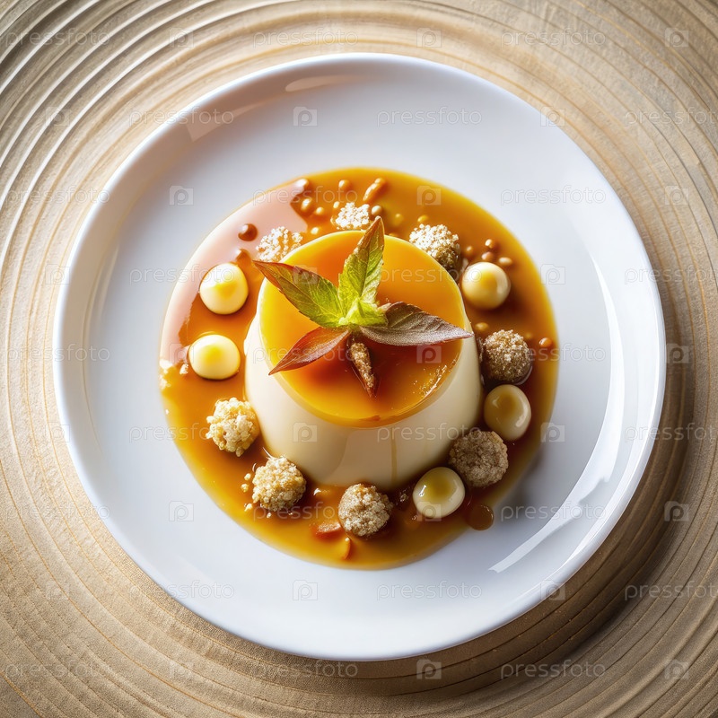 Вкусный карамельный десерт красиво представлен на белой тарелке с гарнитурами, установленной на деревянном фоне