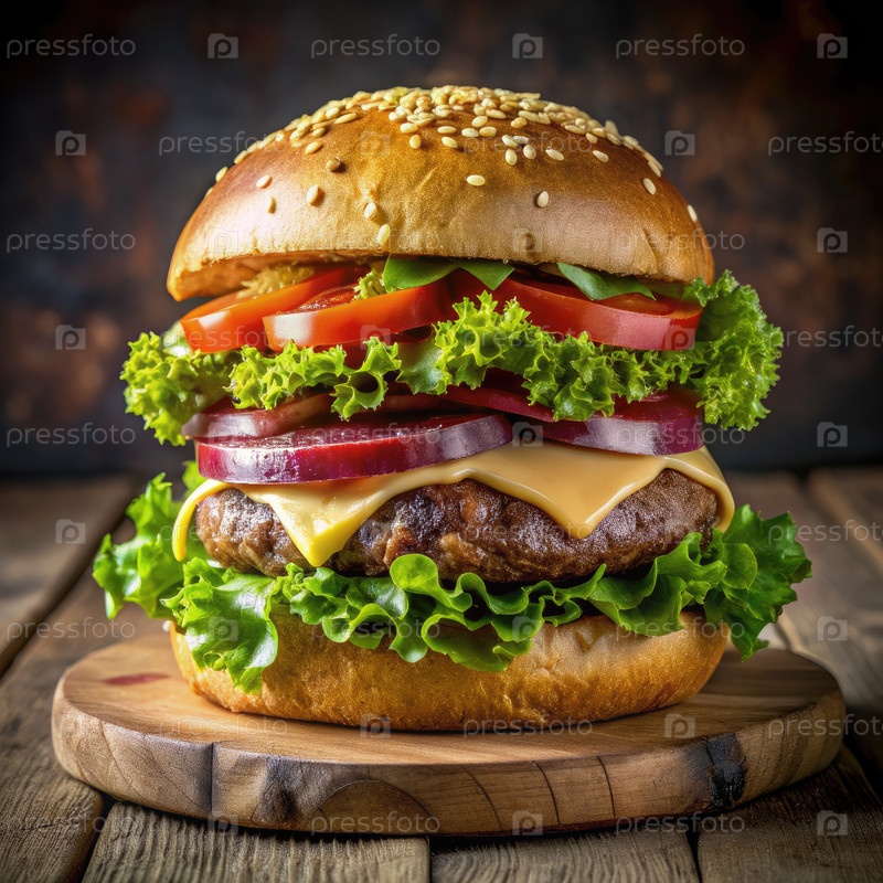 Вкусный ручной гамбургер, сложенный высоко со свежими ингредиентами на деревянной тарелке