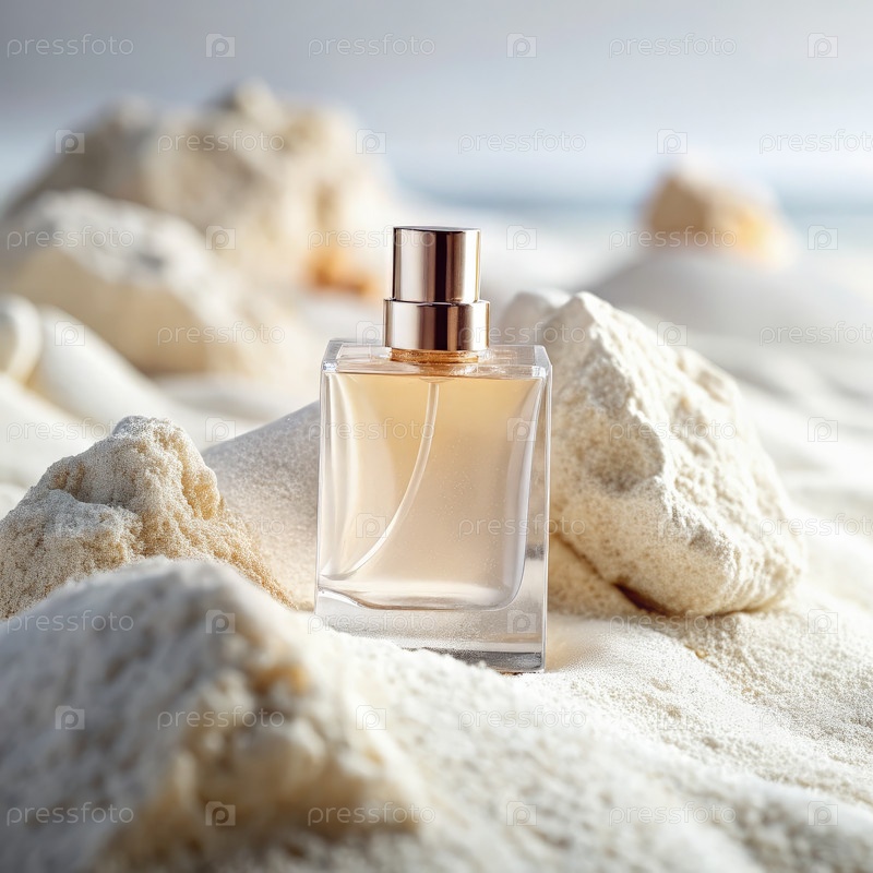 Бутылка парфюма, опирающаяся на песок недалеко от берега под мягким солнечным светом