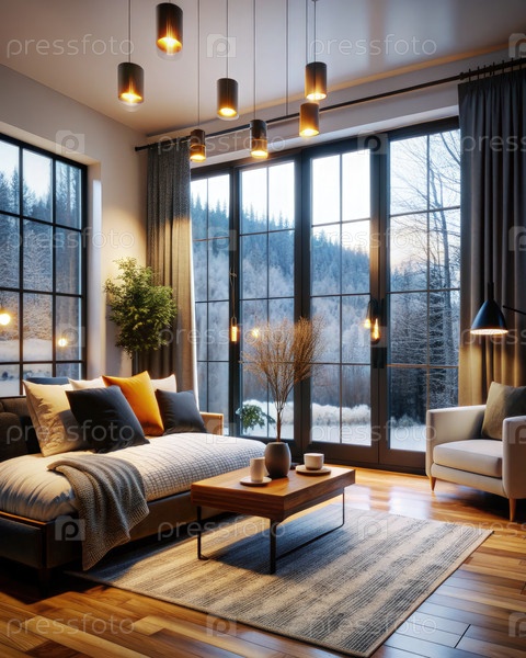 Уютное помещение с большими окнами, демонстрирующими зимний пейзаж, с удобным диваном, теплым освещением и комнатными растениями