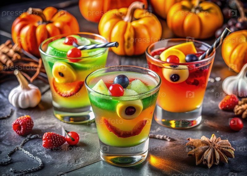 Близкий снимок красочных коктейлей на тему Хэллоуина с фруктами и жуткими гарнирами в окружении тыквен и праздничных украшений