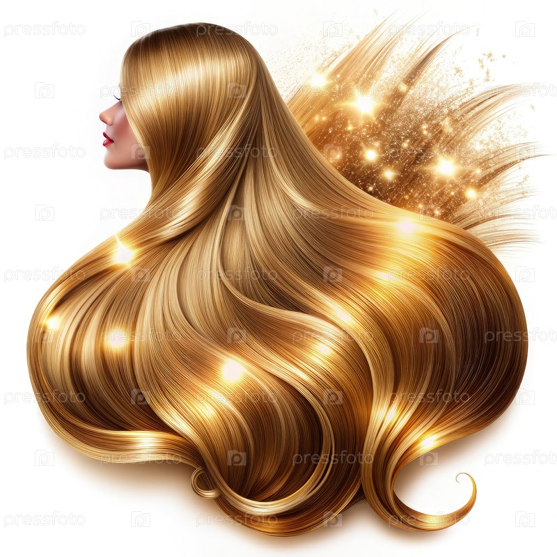 Женщина с красивыми мерцающими и блестящими длинными волосами, изящно протекающие на ярком белом фоне, демонстрирующих ее яркий блеск и текстуру
