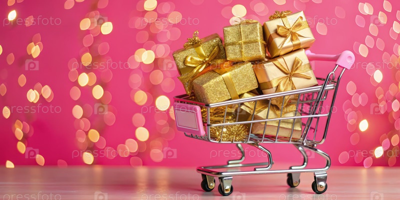 Золотая корзина, заполненная коробками для подарков на праздничном фоне