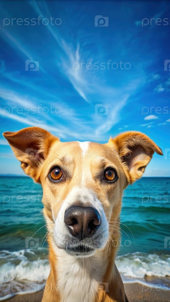 Забавная собака любопытно смотрит на камеру у океана с чистым голубым небом на заднем плане в солнечный день