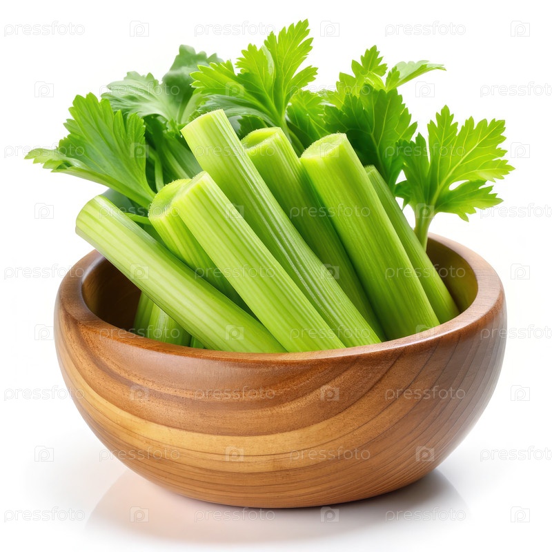 Свежие стебли и листья сельдерея аккуратно расположены в деревянной таре на ярко-белом фоне, демонстрирующих естественные цвета и текстуры