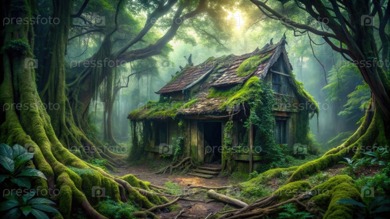 Страшная атмосфера густого темного леса с таинственной заброшенной хижиной на рассвете