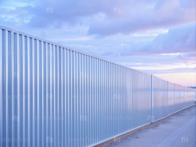 Профильный листовой забор на закате с видом на спокойный пейзаж