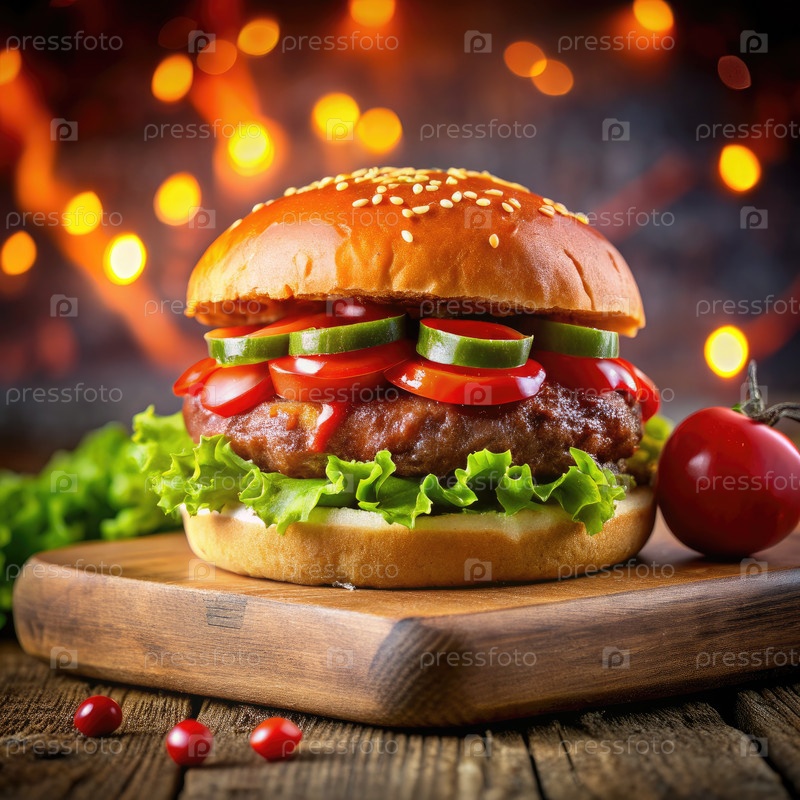 Вкусный бургер отображается на деревянной доске со свежими ингредиентами и фоновыми огнями