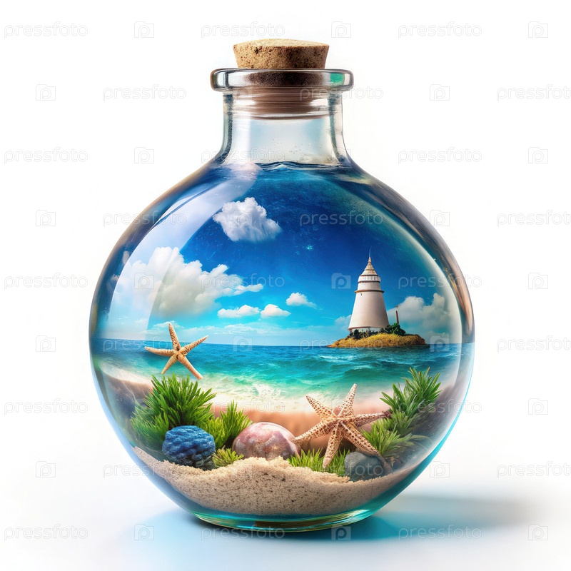 Креативная и уникальная стеклянная бутылка, захватывающая спокойный прибрежный ландшафт с маяком, ракушками и ярким голубым небом