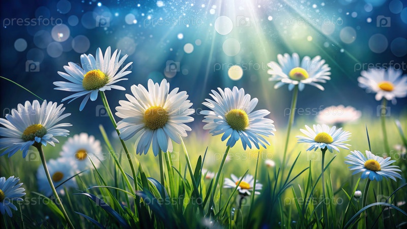 Яркий дисплей цветущих маргариток захватывает сущность весны с теплым солнечным светом и мягким синим фоном в безмятежном пейзаже природы