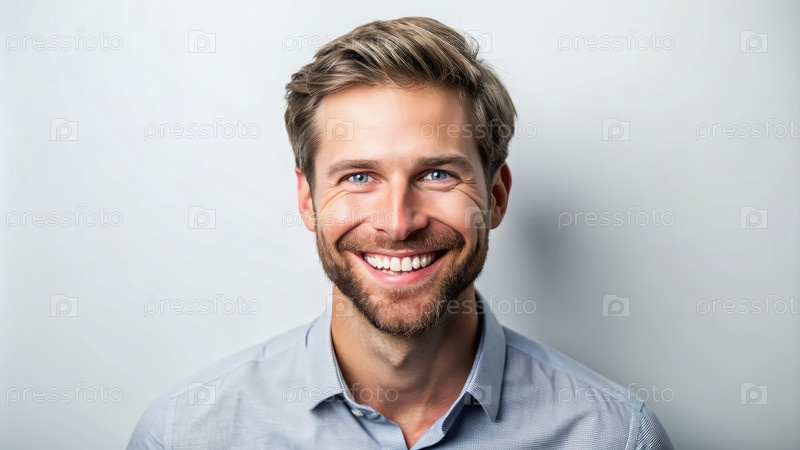 Веселый мужчина с бородой широко улыбается камере в яркой, простой обстановке днем