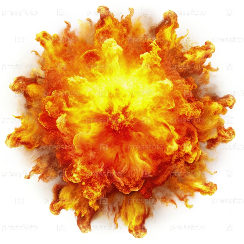 Динамический оранжевый взрыв, изображающий огненное извержение с интенсивными пламенами и дымом на белом фоне