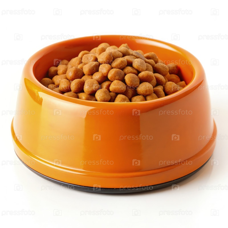 Керамическая собачья миска, заполненная сухим кормом для собак, помещенной на чистую поверхность и готовую к еде домашнего питомца в течение дня