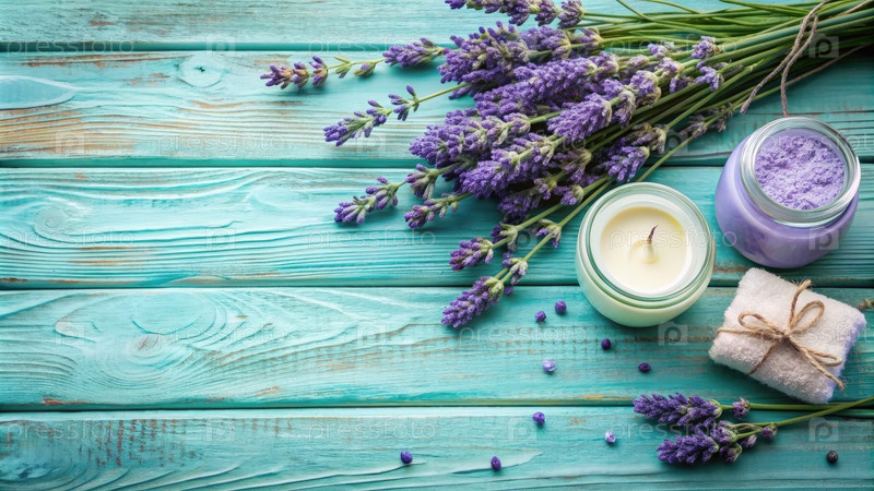 Спокойная обстановка с лавандовыми веточками, ароматическими свечами и расслабляющими солями ванны, расположенными на деревянных поверхностях