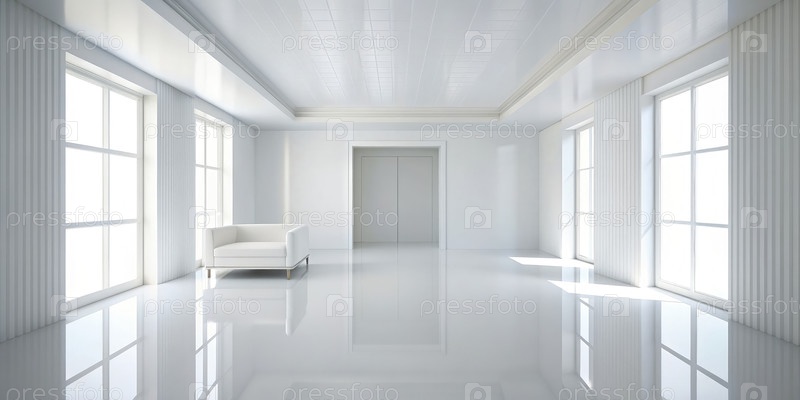 Яркая современная белая комната с большими окнами и полированным полом